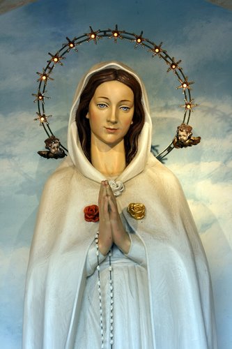 Khung cầu thang được trang hoàng rất đẹp bởi những bông hồng mầu đỏ, trắng và vàng. Đức Mẹ Đồng Trinh hiện ra trong y phục trắng chói lòa với hai tay chắp lại. Ngài đứng trên một tấm thảm rực rỡ ngay trên đầu cầu thang, Kết bằng các bông hồng mầu đỏ trắng và vàng.
