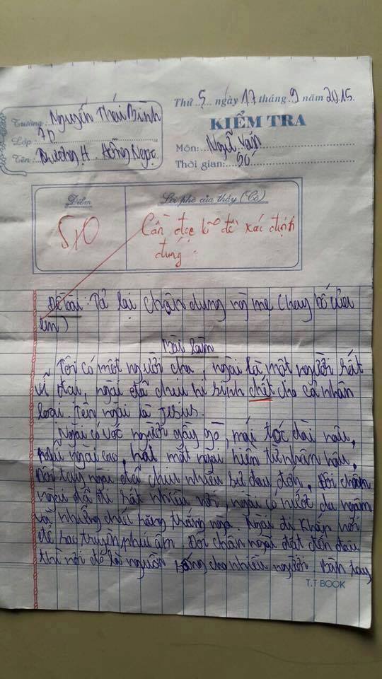 Gần đây trên mạng xã hội Việt Nam đang lan truyền rộng rãi một bài làm văn của một em học sinh miêu tả Chúa Jesus với đề bài “Miêu tả chân dung người mẹ/bố của em”.
