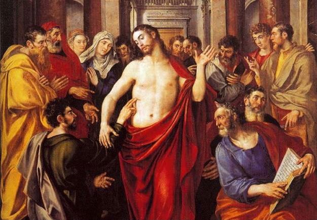 “Một người trong Nhóm Mười Hai, tên là Tô ma, cũng gọi là Điđymô, không ở với các ông khi Chúa Giêsu đến. Các môn đệ khác nói với ông: “Chúng tôi đã được thấy Chúa!” Ông Tôma đáp: “Nếu tôi không thấy dấu đinh ở tay Ngài, nếu tôi không xỏ ngón tay vào lỗ đinh và không đặt bàn tay vào cạnh sườn Ngài, tôi chẳng có tin.” Tám ngày sau, các môn đệ Chúa Giêsu lại có mặt trong nhà, có cả ông Tôma ở đó với các ông. Các cửa đều đóng kín. Chúa Giêsu đến, đứng giữa các ông và nói: “Bình an cho anh em .” Rồi Ngài bảo ông Tôma: “Đặt ngón tay vào đây, và hãy nhìn xem tay Thầy. Đưa tay ra mà đặt vào cạnh sườn Thầy. Đừng cứng lòng nữa, nhưng hãy tin .” Ông Tôma thưa Ngài: “Lạy Chúa của con, lạy Thiên Chúa của con! ” Chúa Giêsu bảo: “Vì đã thấy Thầy, nên anh tin. Phúc thay những người không thấy mà tin!” (Gioan 20: 19-29).