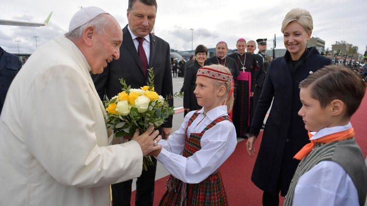 Khi đến phi trường Riga, từ trên máy bay bước xuống, ĐTC đã được Tổng thống Raimonds Vejonis, cùng với Đức TGM sở tại, Zbignews Stankevics, tiếp đón, và hai em bé trong y phục truyền thống tặng hoa cho Ngài, trước hàng quân danh dự.