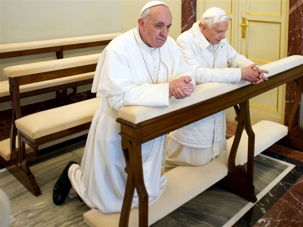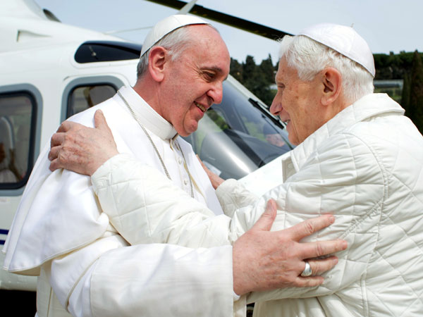 “Máy bay trực thăng đã đáp xuống sân bay trực thăng ở Castel Gandolfo vào khoảng 12 giờ 15 phút, và xe chở Đức nguyên giáo hoàng đến gần nơi đáp máy bay trực thăng. Đức giáo hoàng Phanxicô bước xuống, có Đức TGM Becciu, Đức ông Leonardo Sapienza và Đức ông Alfred Xuereb cùng đi. Khi Đức giáo hoàng Phanxicô vừa xuống khỏi máy bay, hai vị giáo hoàng đã ôm chào nhau. Sau khi chào những người có mặt: Đức cha Marcello Semeraro – giám mục giáo phận Albano và ông Saverio Petrillo, Giám đốc Dinh giáo hoàng, hai vị đã lên xe: Đức giáo hoàng Phanxicô ngồi bên phải, ở vị trí thông thường của giáo hoàng, còn Đức Bênêđictô ngồi bên trái. Đức TGM Georg Gänswein, Chủ tịch Phủ Giáo hoàng, cùng đi trên xe này. Chiếc xe đưa mọi người đến thang máy và hai nhân vật chính của cuộc gặp gỡ lịch sử này đi lên các phòng bên trên; ngay sau đó các ngài đến nhà nguyện để cầu nguyện một lúc. Đức nguyên giáo hoàng Bênêđictô nhường chỗ danh dự cho Đức giáo hoàng Phanxicô, nhưng Đức giáo hoàng đương kim nói: “Chúng ta là anh em”, và muốn hai người cùng quỳ với nhau trên cùng một băng ghế.