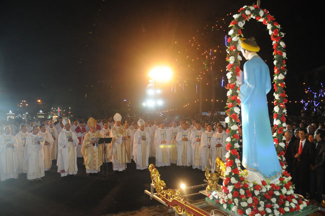 Kết thúc Thánh lễ, cộng đoàn quy tụ trước tiền đường nhà thờ để tôn vinh Đức Mẹ La Vang trong lời kinh Thánh Mẫu La Vang. Sau đó Đức Khâm sứ Tòa Thánh xông hương kính Đức Mẹ và tượng Đức Mẹ La Vang được cung nghinh lên trước ban công ngôi nhà thờ Mẹ của Giáo phận trong niềm vui háo hức của con cái Mẹ. Một lần nữa, màn pháo hoa rực sáng giữa trời Phủ Cam, tôn vinh Mẹ La Vang là quan thầy của TGP Huế.