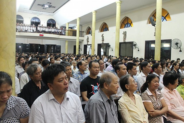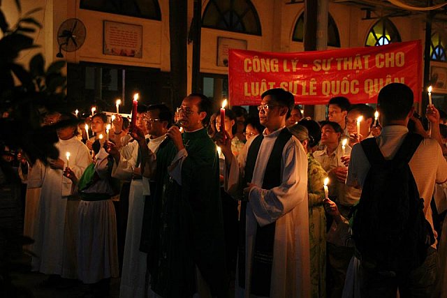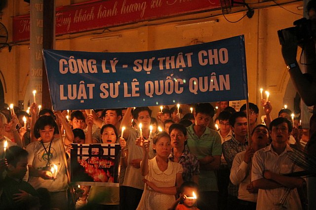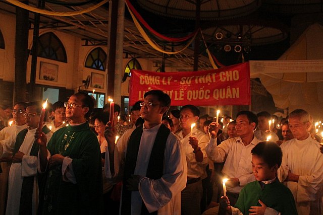VRNs (01.07.2013) – Hà Nội – Hàng ngàn ngọn nến được thắp lên tại nhà thờ Thái Hà trong Thánh Lễ 20g00 Chúa Nhật, ngày 30/06/2013 cầu nguyện đặc biệt cho Công Lý – Hòa Bình và cho Luật sư Lê Quốc Quân. Chủ tế thánh lễ là cha Gioan Lưu Ngọc Quỳnh, một người đồng hương với Luật sư Giuse Lê Quốc Quân. Đồng tế với ngài có cha Giuse Nguyễn Văn Phượng, Chánh xứ Thái Hà và cha P.X. Nguyễn Kim Phùng.