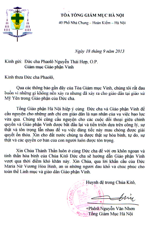 Trước sự việc đau thương xảy ra gần đây tại Giáo xứ Mỹ Yên, Giáo phận Vinh, trong tình hiệp thông của Giáo tỉnh Hà Nội, ngày 18/09/2013 Đức Tổng Giám Mục Phê-rô Nguyễn Văn Nhơn – Tổng Giám Mục Hà Nội – đã gửi thư an ủi và hiệp thông với Đức cha Phaolô Nguyễn Thái Hợp và toàn thể Giáo phận Vinh.