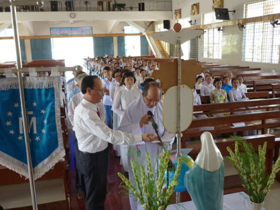 Phải nói anh Đa Minh Tạ Ngọc Hải là người có nhiều công khó trong việc hình thành Legio ở đây nhưng Chúa cũng gửi cho không ít…Thánh Giá, mong anh bền lòng  mà…vác cho nên. Về việc vác Thánh Giá thì chẳng có ông Thánh bà Thánh nào không phải vác và sở dĩ các ngài làm Thánh cũng chỉ vì  đã bằng lòng mà vác đó  thôi. Về ý nghĩa của việc Dâng Mình, cha linh giám đã triển khai câu khẩu hiệu Totus Tuus của chân phúc Gioan Phaolo II để ứng dụng cho cuộc sống đạo tận hiến của người Legio. Câu khẩu hiệu Totus Tuus là tóm tắt ý của Thánh Maria Gringon de Mongfort  được Legio lấy làm câu Dâng Mình “ Lạy Nữ Vương Là Mẹ Con, toàn thân con thuộc về Mẹ và mọi sự của con là của Mẹ” Dâng toàn thân có nghĩa là dâng cả sức khỏe, tài năng, ý chí và cả những khuyết điểm, thiếu sót của ta trong  quá khứ hiện tại  lẫn tương lai cho Đức Mẹ. Mục đích sâu xa của việc Dâng Mình này là để Đức Mẹ thánh hóa toàn bộ cuộc đời của ta hầu ngày càng nên giống Chúa Giesu Con Chí Thánh của Mẹ.