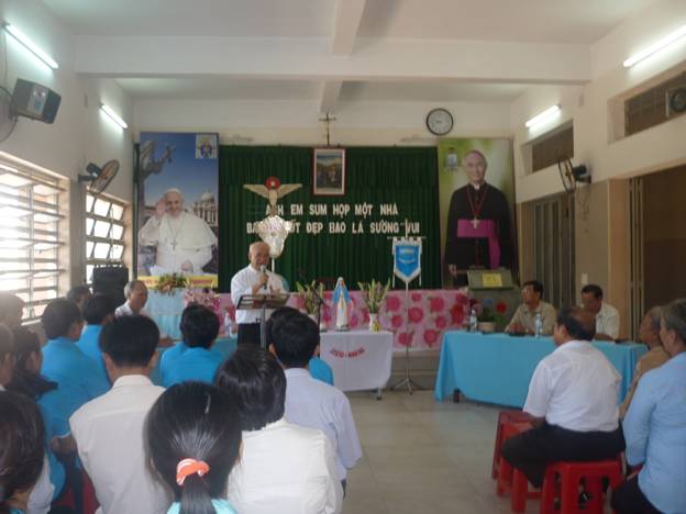 Tiếp theo sau phần thảo luận đề tài I; anh trưởng Curia mời cha Chánh xứ Đinh Nam Hưng thay cha Linh Giám Curia ban huấn từ đồng thời giới thiệu các anh trong Ban Giảng Huấn HĐ Comitium cũng như trình diện với cha hơn 200 HV tham dự buổi tập huấn hôm nay. Cha cho biết ngay từ hồi còn là đại chủng sinh CV Thánh Giu Se Sài Gòn cha đã ở trong Legio, hàng tháng vẫn đi công tác thăm viếng các cơ sở từ thiện bác ái trong vùng. Sau biến cố bảy lăm bị đưa đi cải tạo nhiều năm trở về coi xứ Thạch An. Tiếp đó là GX Bùi Chu và làm quản hạt Phú Thịnh cho đến nay. Chính vì có cái…gốc Legio như thế nên cha rất am hiểu đường lối cũng như cơ cấu tổ chức của đoàn thể này.