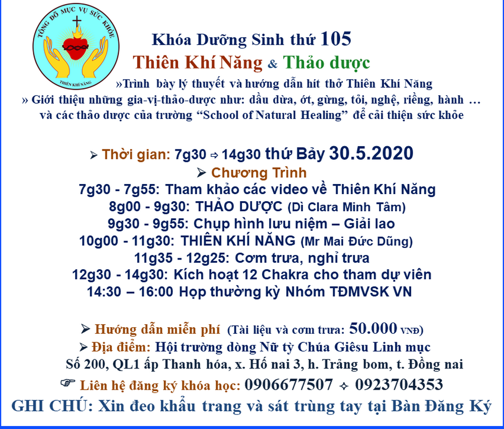 Giới thiệu Khóa Dưỡng sinh thứ 105, thứ Bảy 30/5/2020 tại Việt Nam 16/05/202016/05/2020 Tin Tức Kính giới thiệu đến Anh Chị Em. Trân trọng, Tông đồ Mục vụ Sức khỏe Việt Nam Chia sẻ Bài này:
